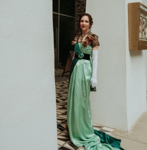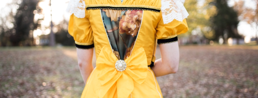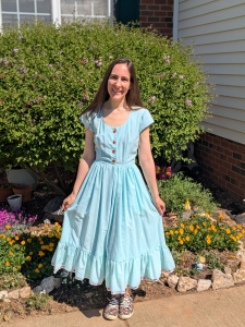 It wasn’t until my twenties that I began sewing again. I didn’t start with the historical costumes because that felt too daunting. Instead, I made a cute, summery dress pictured here. The dress pattern was a vintage dress from the 1980’s featuring a young Brooke Shields. The final creation was simple and it wasn’t perfect, but it was a start. It took me nine more years to work up the courage to finally start making historical costumes!